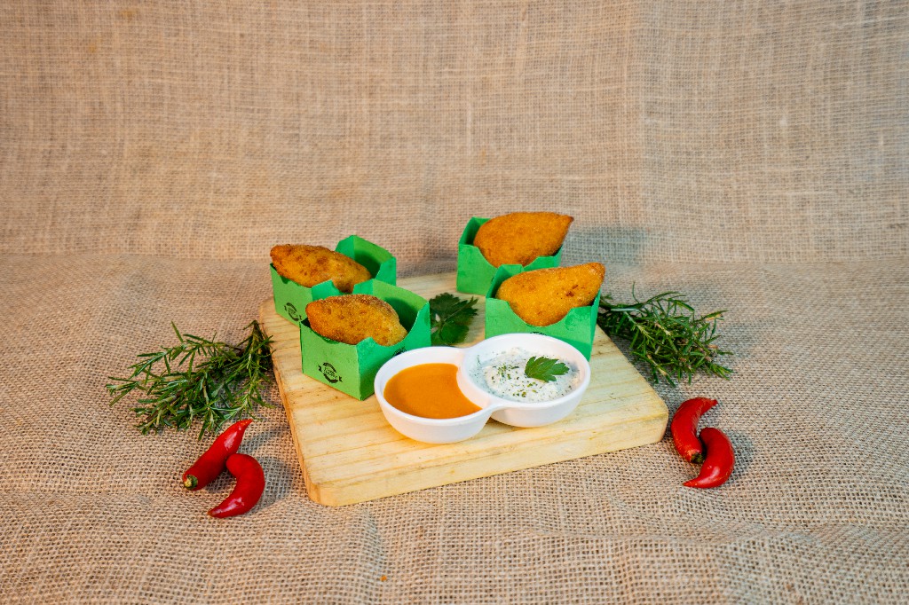 Quarteto Mineiro Quatro unidades de minipão francês recheado com carne de panela, pasta de alho, cheddar, cream cheese e queijo gratinado. Acompanha molho de pimenta, vinagrete e uma dose de cachaça.